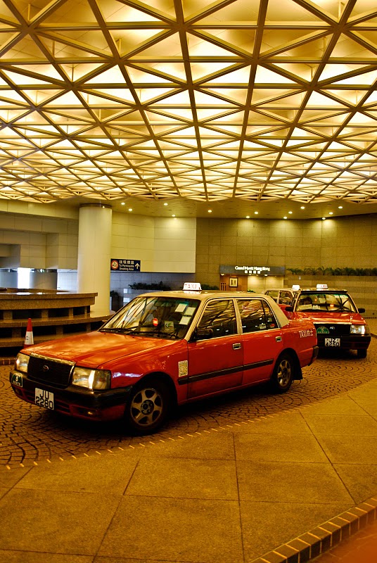 Taxis in Hong Kong are red! They also drive on the wrong side of the road, just like in the UK.