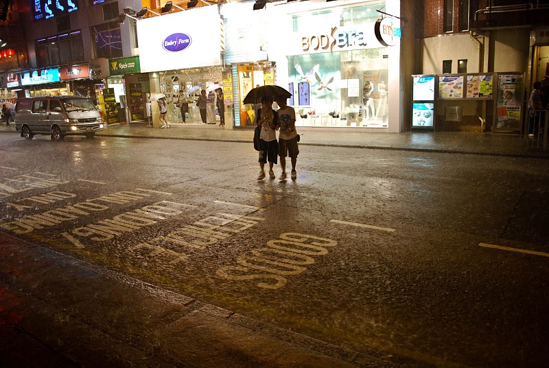 Two random people caught in the downpour from the typhoon.